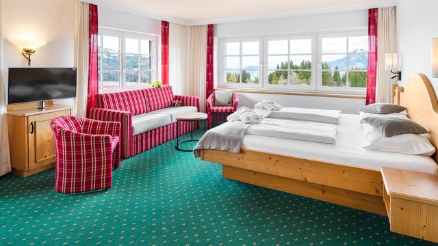 Familiensuite mit gemütlichem Wohn-Schlafraum für die Eltern. Kinderzimmer mit kuscheligem Spielwiesenstockbett. Stillvoll-gemütliche Einrichtung mit viel Sichtholzwänden und Einbaumöbeln aus Esche. Edle Stoffe mit heimeligen Karos.
