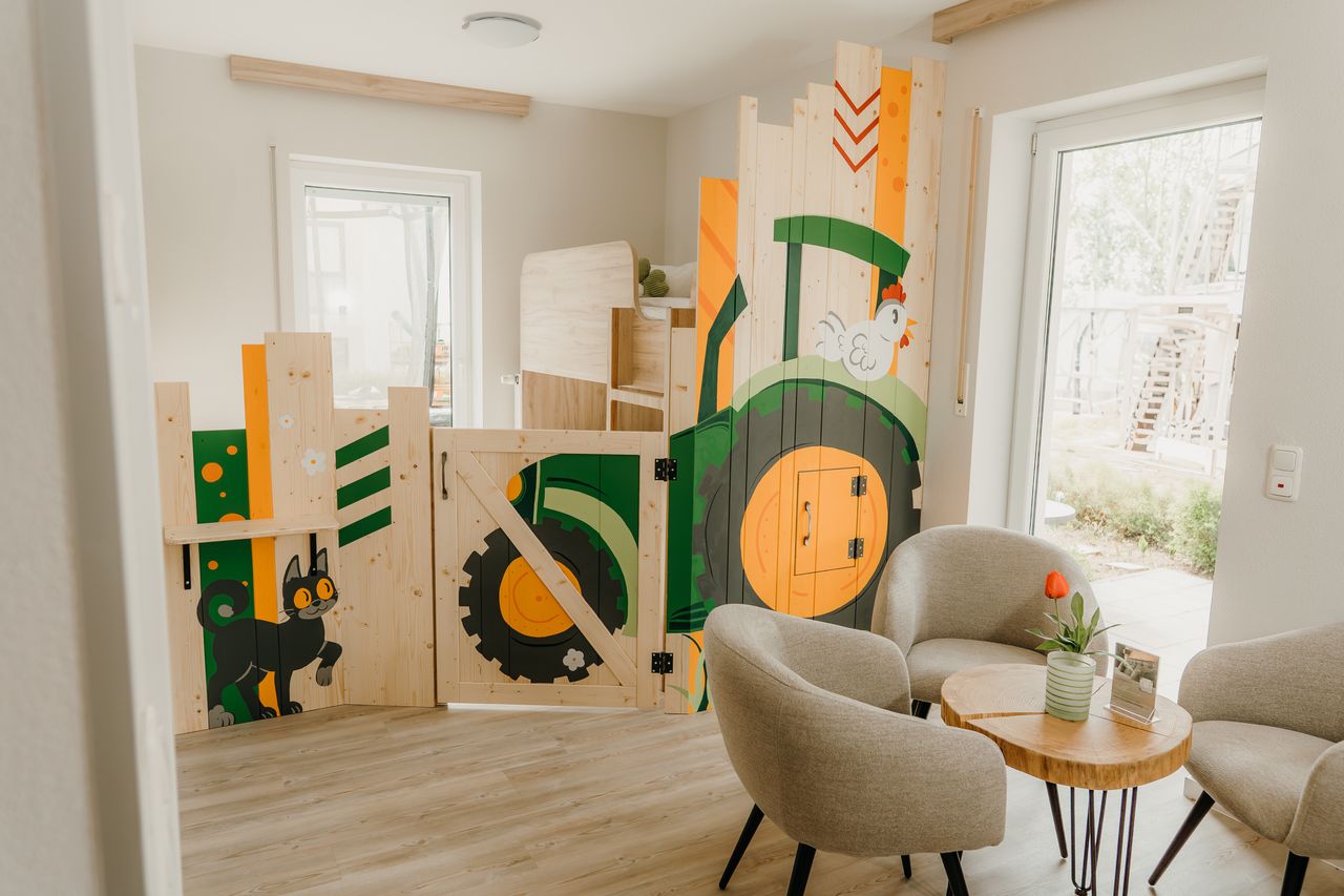 Platz für die ganze Familie. Auf 50 qm im Hauptgästehaus mit Wohn-/Schlafraum und separatem Kinderzimmer mit Etagenbett + Einzelbett