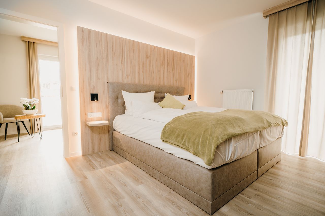 Modernes eingerichtetes Doppelzimmer für Paare und Kleinfamilien in unserem Familienhotel. Auch verfügbar mit handangefertigten Echtholzmöbeln.