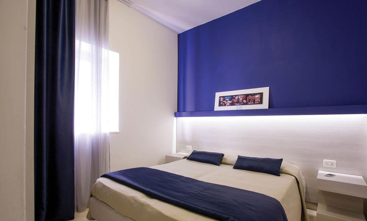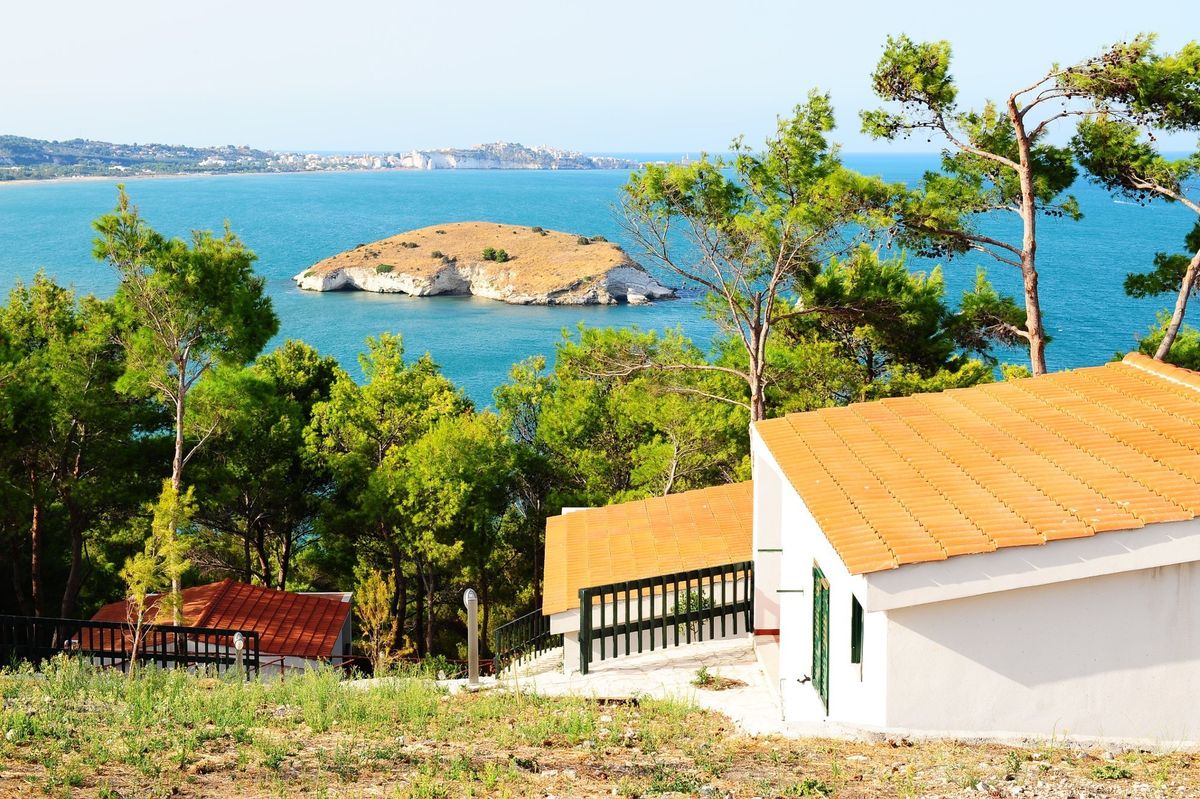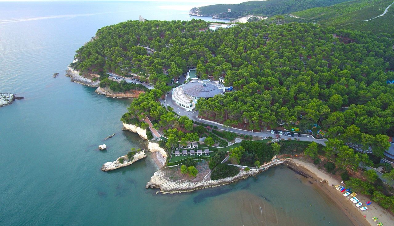 Die Aussicht vom Hotel aus ist atemberaubend: Die kleine Insel vor dem Hotel, die Stadt Vieste im Hintergrund und der grüne Kiefernwald des Gargano-Nationalparks krönen diesen magischen Ort.