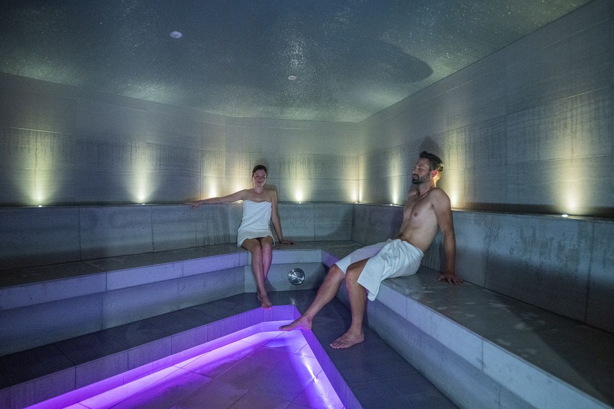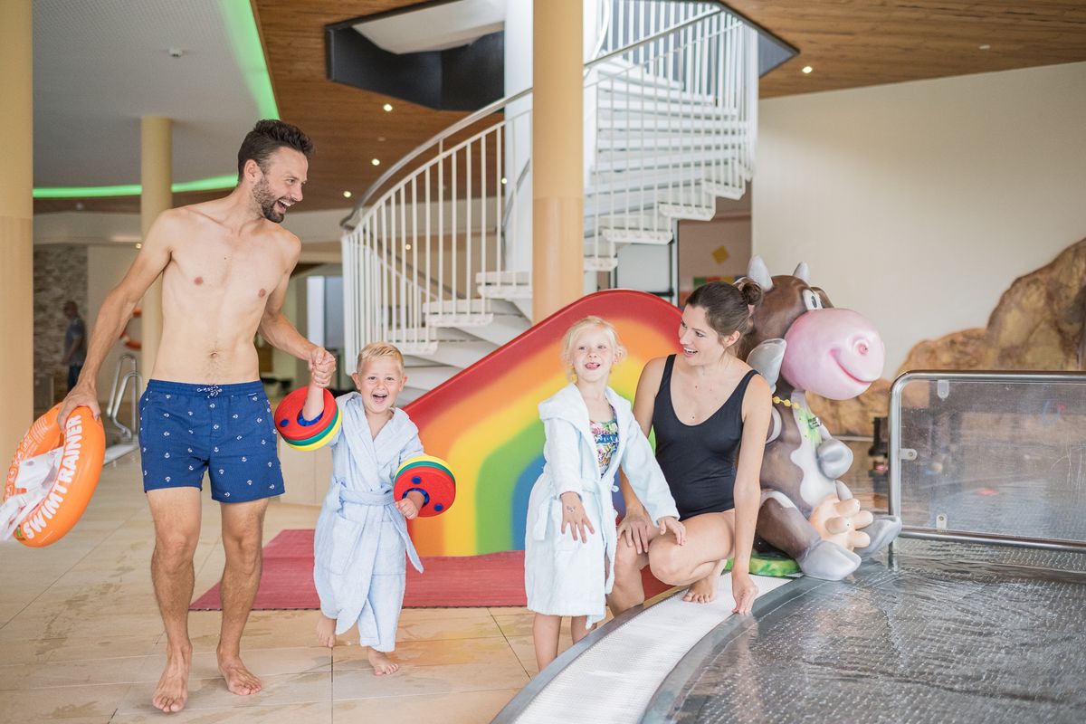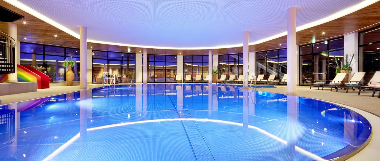 500 m² Hallenbad mit 56 m langer Röhrenrutsche, 115 m² Schwimmbecken mit integrierten Whirlliegen und 2 Kinderbecken mit Spielmöglichkeiten. Großer Liegebereich und Sonnenwiese auf dem Dach.