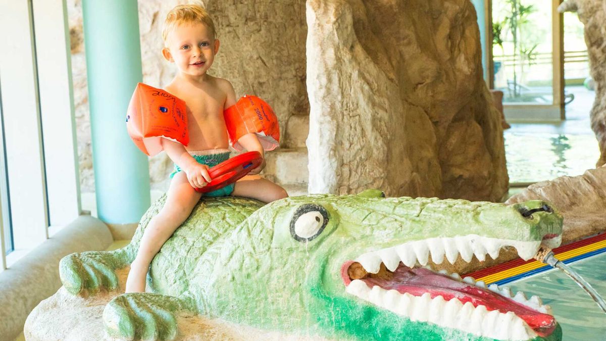 Auf alle Wassernixen und Hochseepiraten wartet das „Family-SPAss-Bad“ mit Indoor- und Outdoor-Panoramapool, 2 Gaudirutschen, Indoor-Babystrandbad, Saunapromenade mit Schwitzhütte und Schneebude, Elternwellness-Wohnzimmer, Ruheraum „Waldflez“ u.v.m.