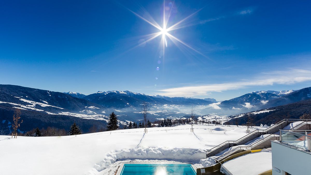 Auf der Dachterrasse schwimmt ihr im beheizten Family Sky Pool, entspannt im Jacuzzi und genießt den Blick auf die Ortlergruppe. Sonnenliegen und Loungemöbel laden zum Verweilen ein.
