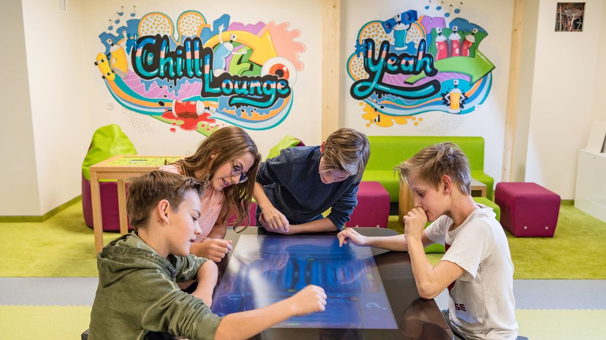 - Teens Lounge: Hier kann gechillt und gezockt werden in lässiger Atmosphäre. Mit bequemen Sitzmöglichkeiten und cooler Musik: iWall, Sonos-Beschallung, Interaktive Spieltisch, Speedball, Big Wave Airhockey, Tischfußball, Arcarde Multigame uvm warten auf euch. Aufgepasst, auch die ältere Generation kann hier mal wieder ganz Kind sein und den Abend gemütlich ausklingen lassen.